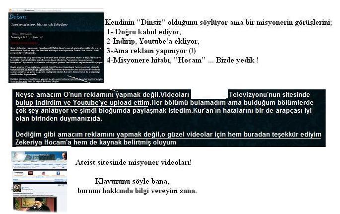 Deizm adlı site açan dinsiz arkadaş bir misyonerin görüşlerini önce ‘doğru’ kabul ediyor, sonra ‘videosunu indirip youtube’a yüklüyor’ ama ‘reklam da yapmıyor!’ ve Mısır’dan dindaşlarınca kovulan bu misyonere bir de ‘hocam’ diye hitap ediyor! İyi ki dinsiz imiş! Ateit bir sitede ise, ‘world’ adlı kullanıcı, 24.07.2015 tarihinde ‘Neden Butros Hocam Gibi Bir Hocamız Yok?’ diye forumda başlık açıyor ve ‘çatır çatır İslamı yerin dibine gömen ve kanalı olan elini kolunu sallaya sallaya gerçeği söyleyen muhterem hocam gibi bir ateist hocamız neden yok? Zekeriya Butros hocam ve ekibini kutluyorum bir ateist olarak canım hocam…Türkiye’de görevini biz ateistler yapıyoruz ama senin kadar güçlü ve cesur değiliz… Zekeriya hocamsa müthiş bir adam İslam’ı o kadar iyi biliyor ki.’ diye yazıyordu!